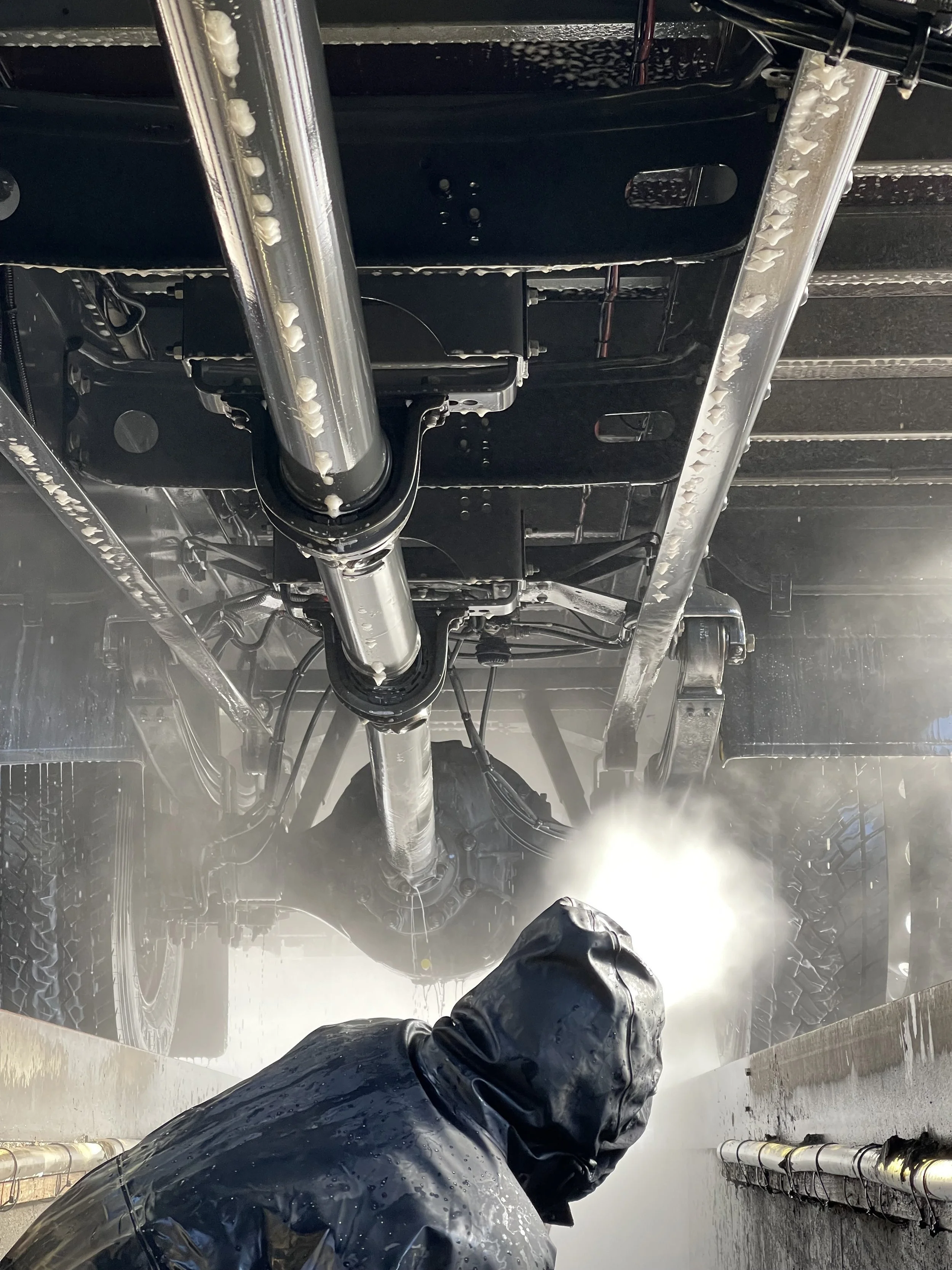 Followed up by a high-pressure, hot detergent cleanse to tackle tough-to-move grease & oil. Extra care is taken around wiring and sensitive areas while specialist lances and nozzles are used for heavily soiled and muddy vehicles.